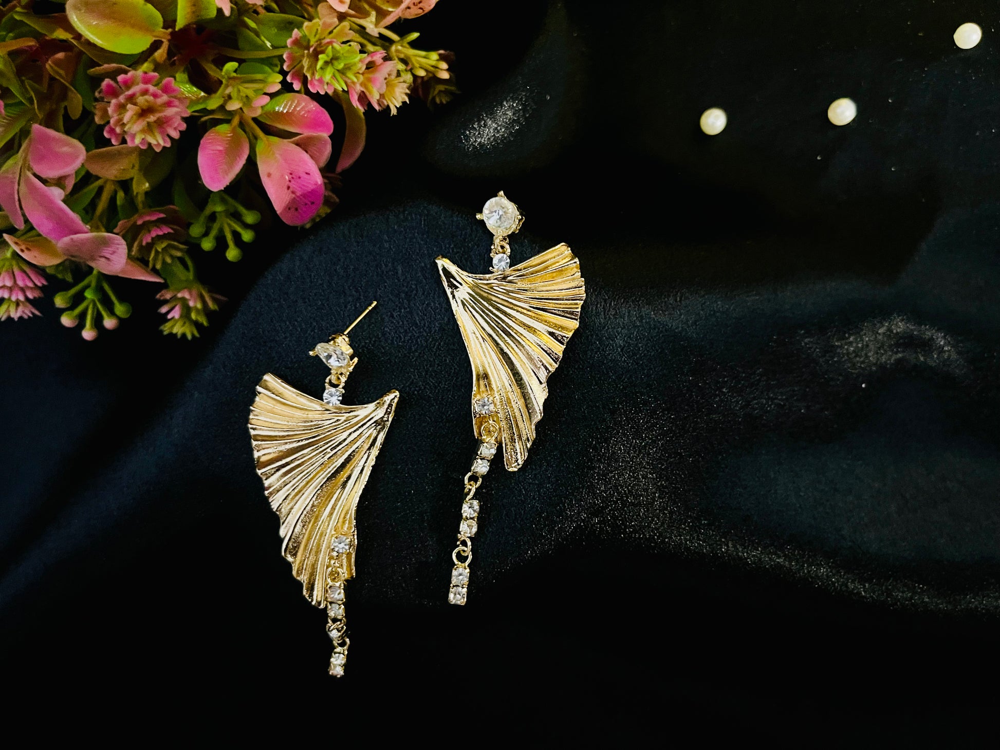 Add a graceful touch to your look with these Golden Leaf Fan Dangle Earrings. Designed in a textured fan-leaf shape with cascading stones, these earrings combine elegance with a bold statement. Lightweight and eye-catching, they are perfect for evening parties, weddings, and festive occasions.