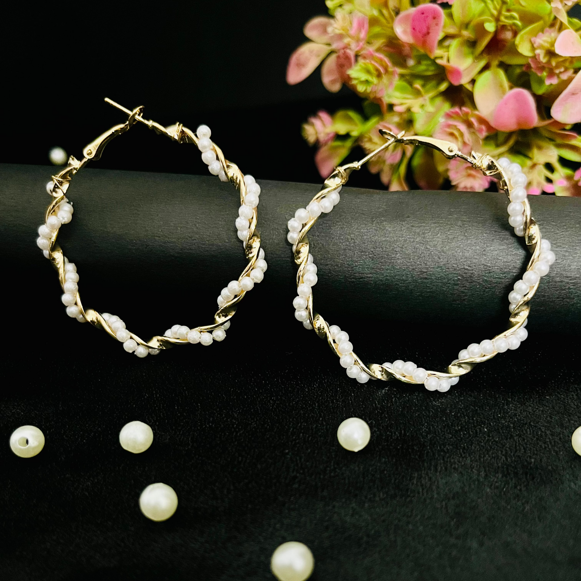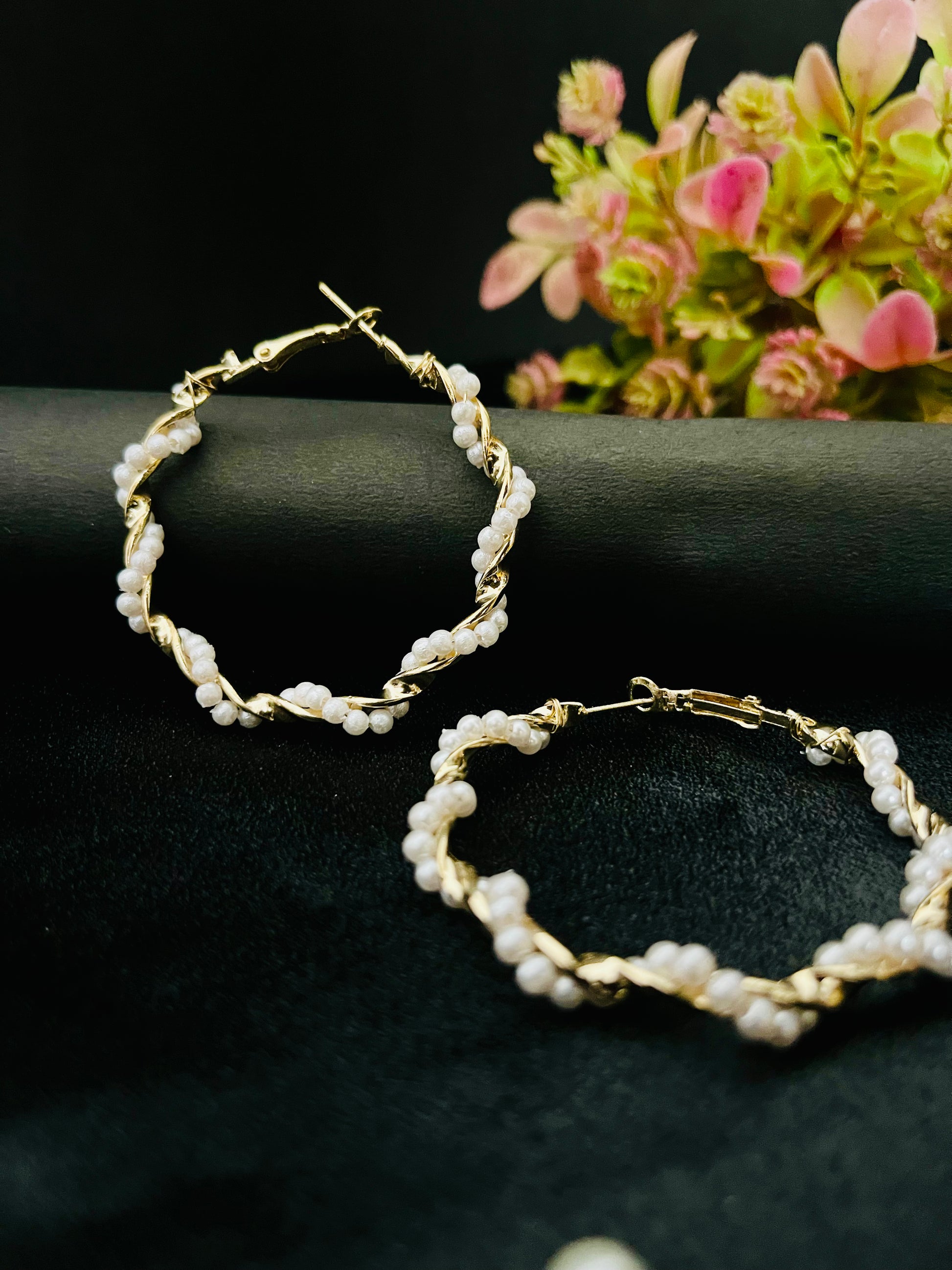 Add timeless elegance to your look with these Golden Pearl-Embellished Hoop Earrings. Featuring a twisted golden frame delicately wrapped with pearl beads, these hoops blend classic charm with modern style. Perfect for special occasions or elevating your everyday outfits.