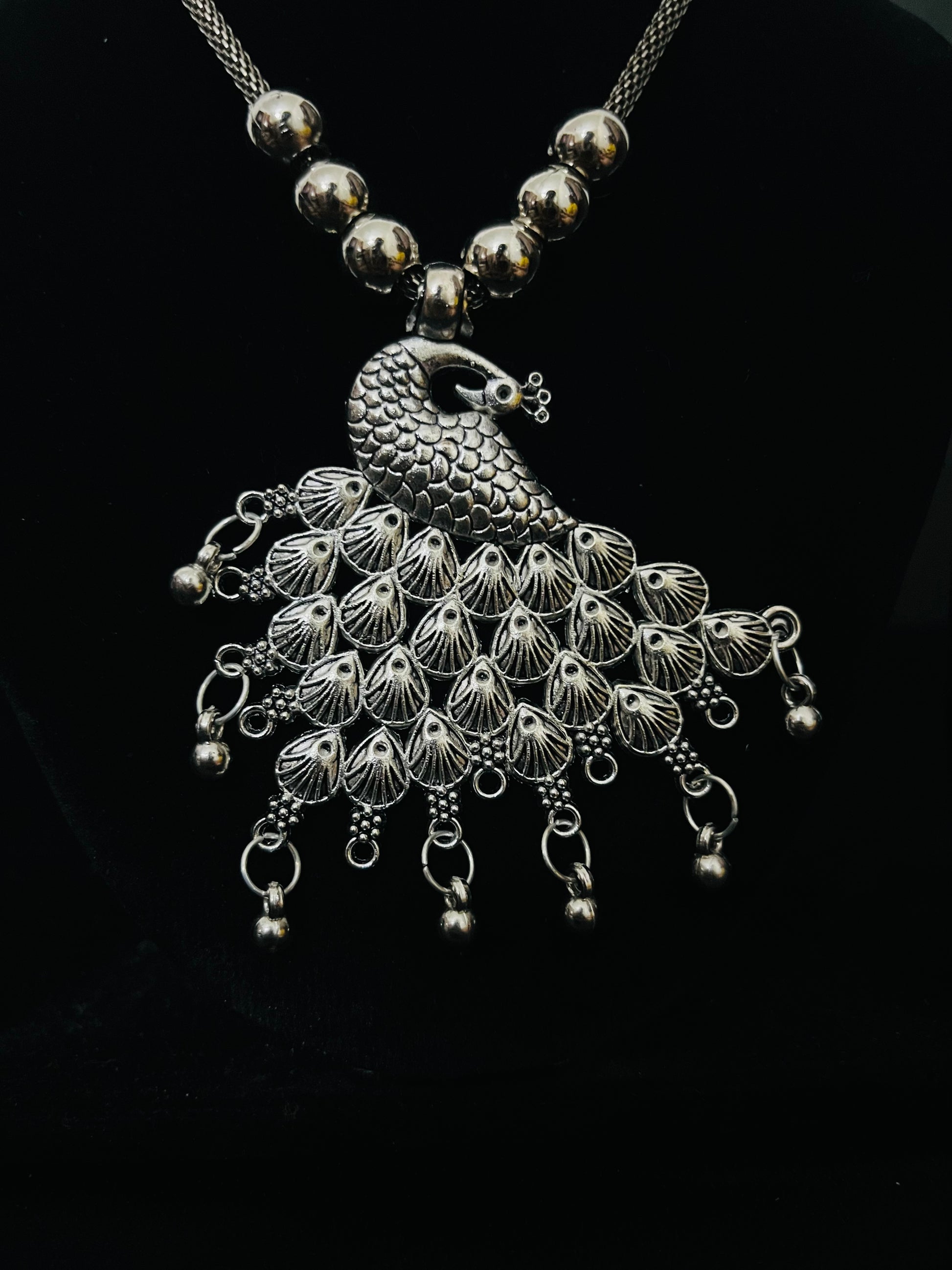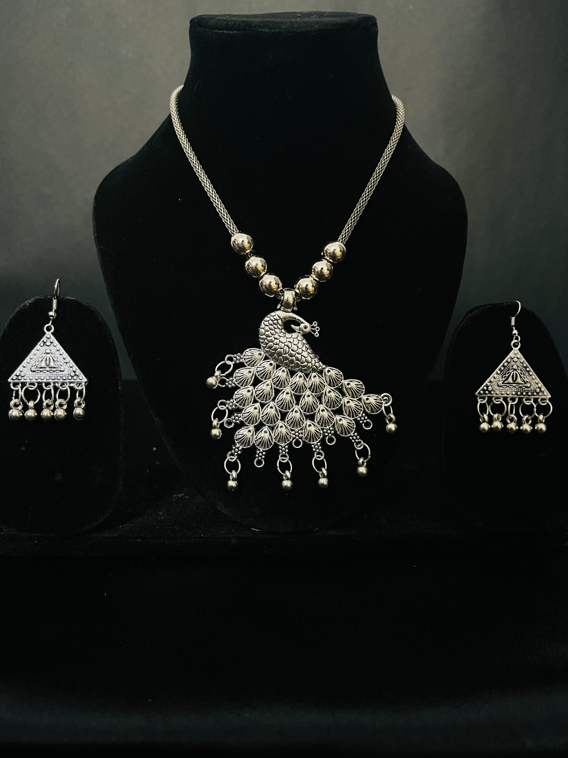 Add a bold ethnic touch with this lightweight oxidized necklace set, featuring a detailed peacock pendant and paired with triangle-shaped jhumka earrings. Designed for comfort and elegance, this set is perfect for both daily wear and festive occasions.