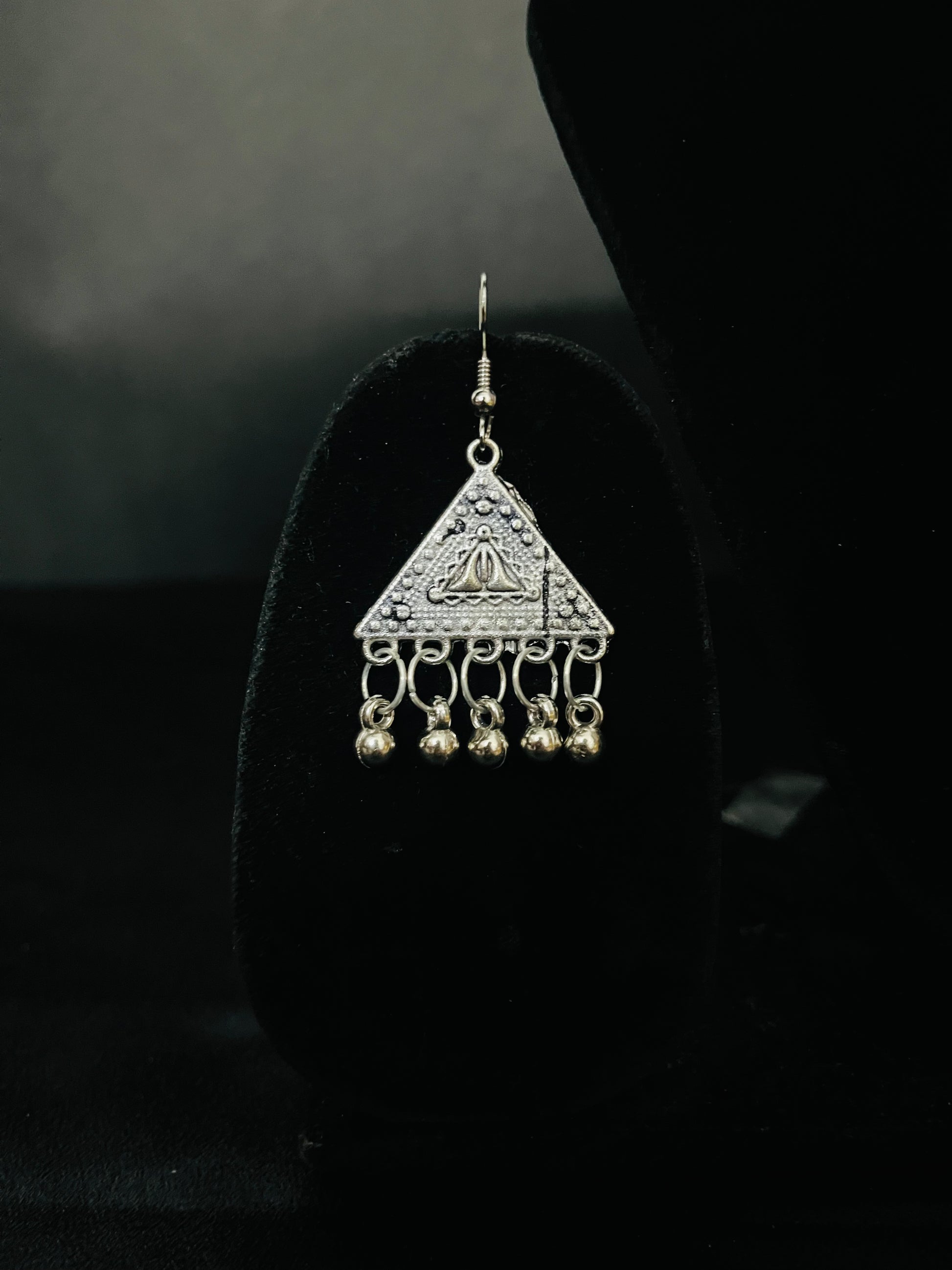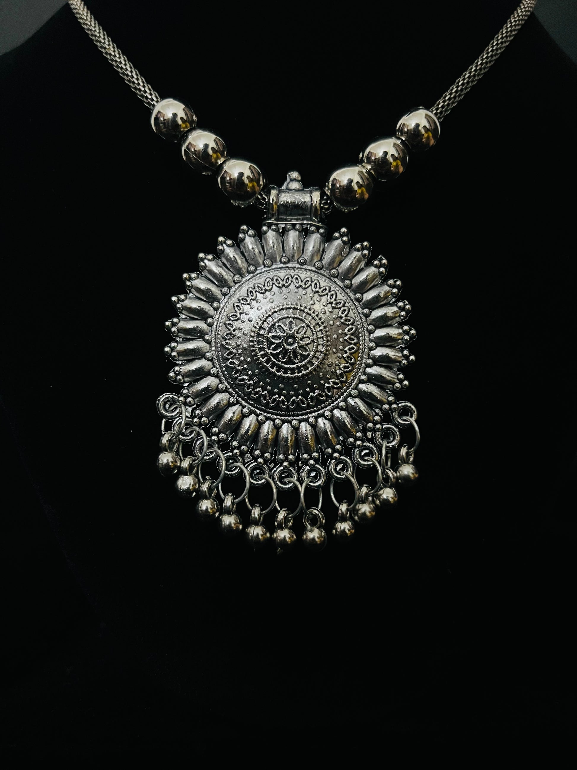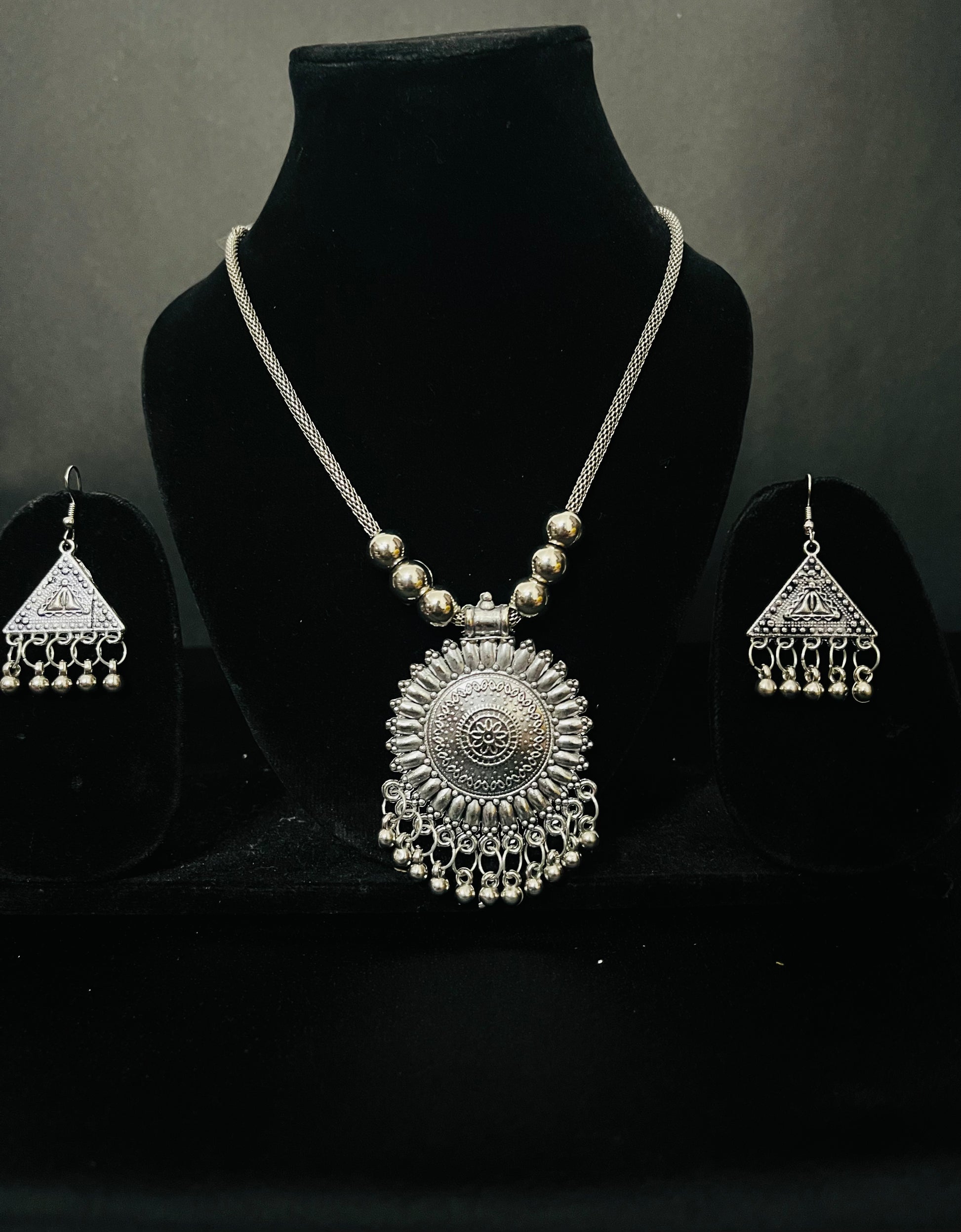 Lightweight Oxidized Necklace Set with Round Pendant & Triangle Jhumka Earrings