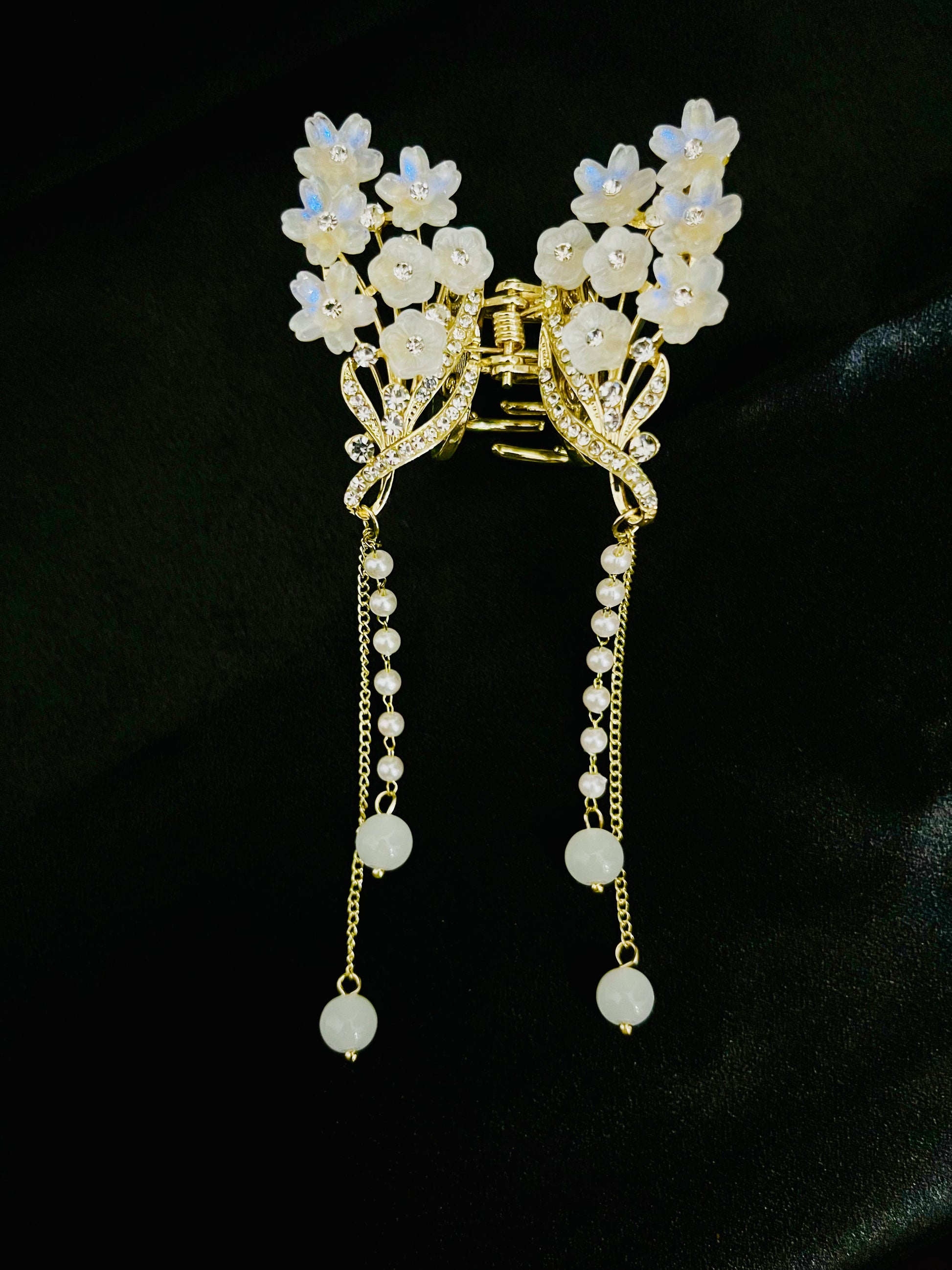 Luxury White Floral Butterfly Hair Clutcher with Pearls and Crystal Detailing