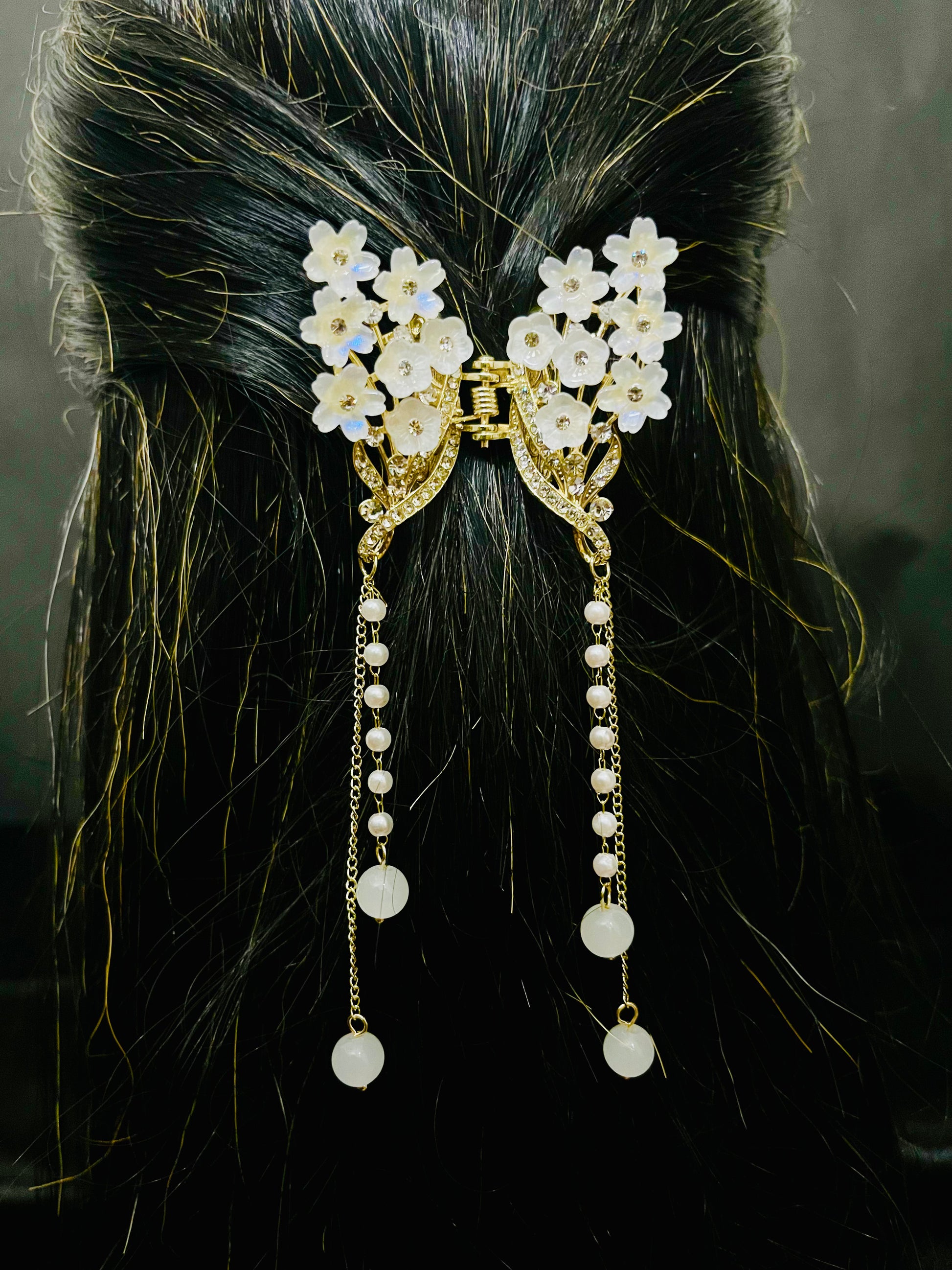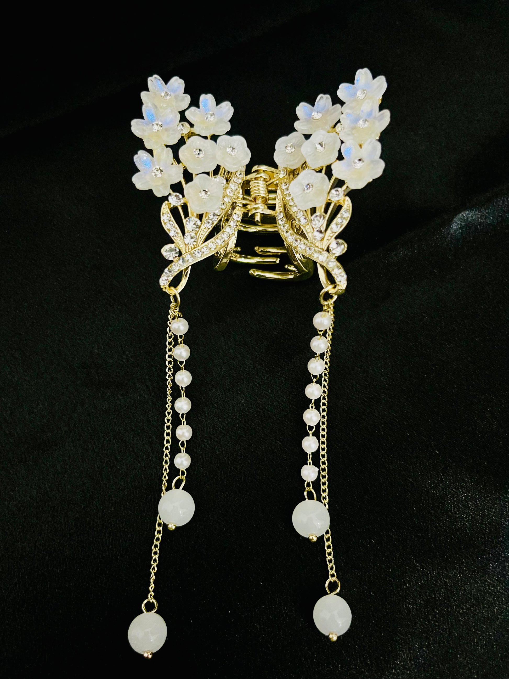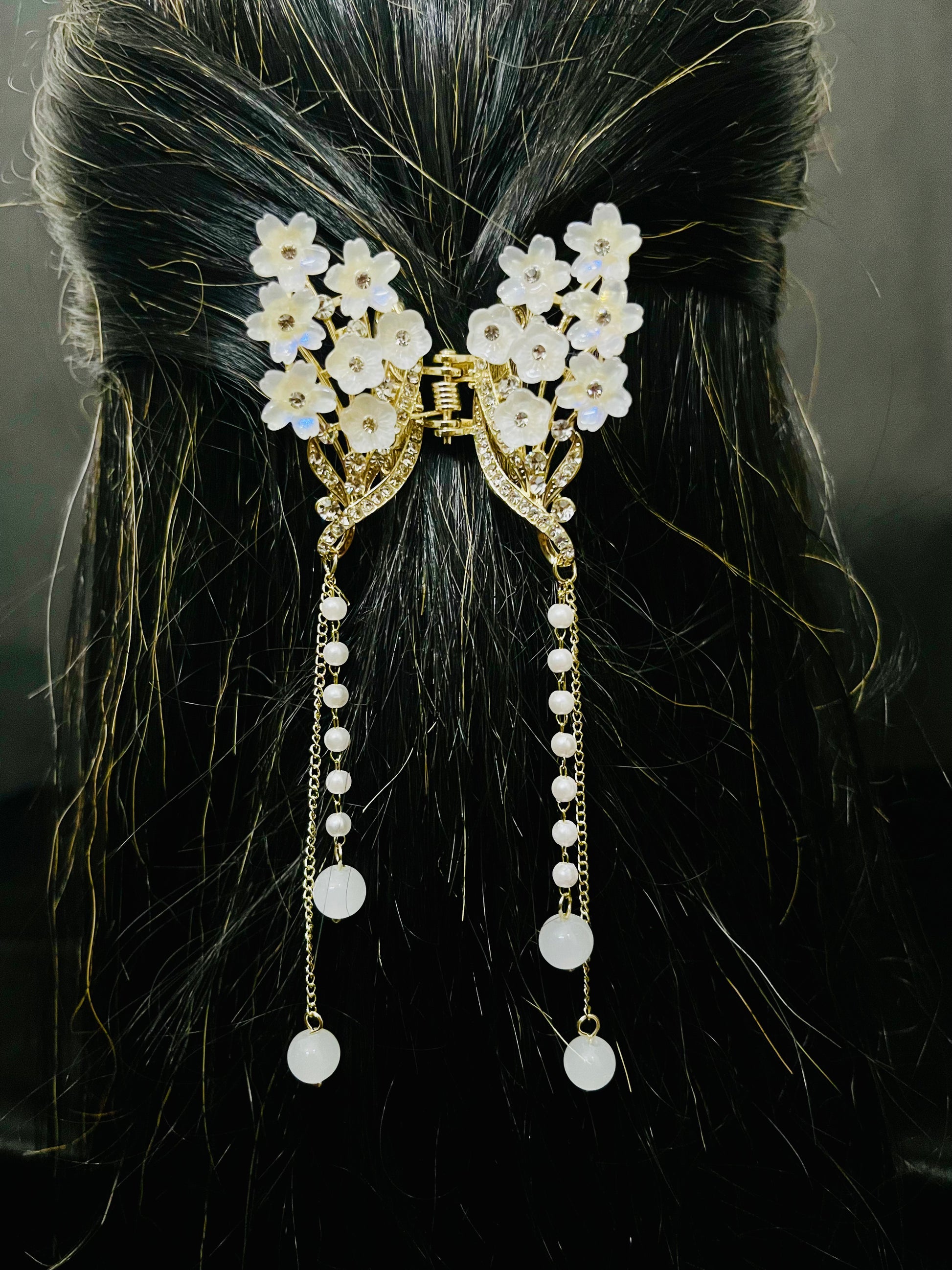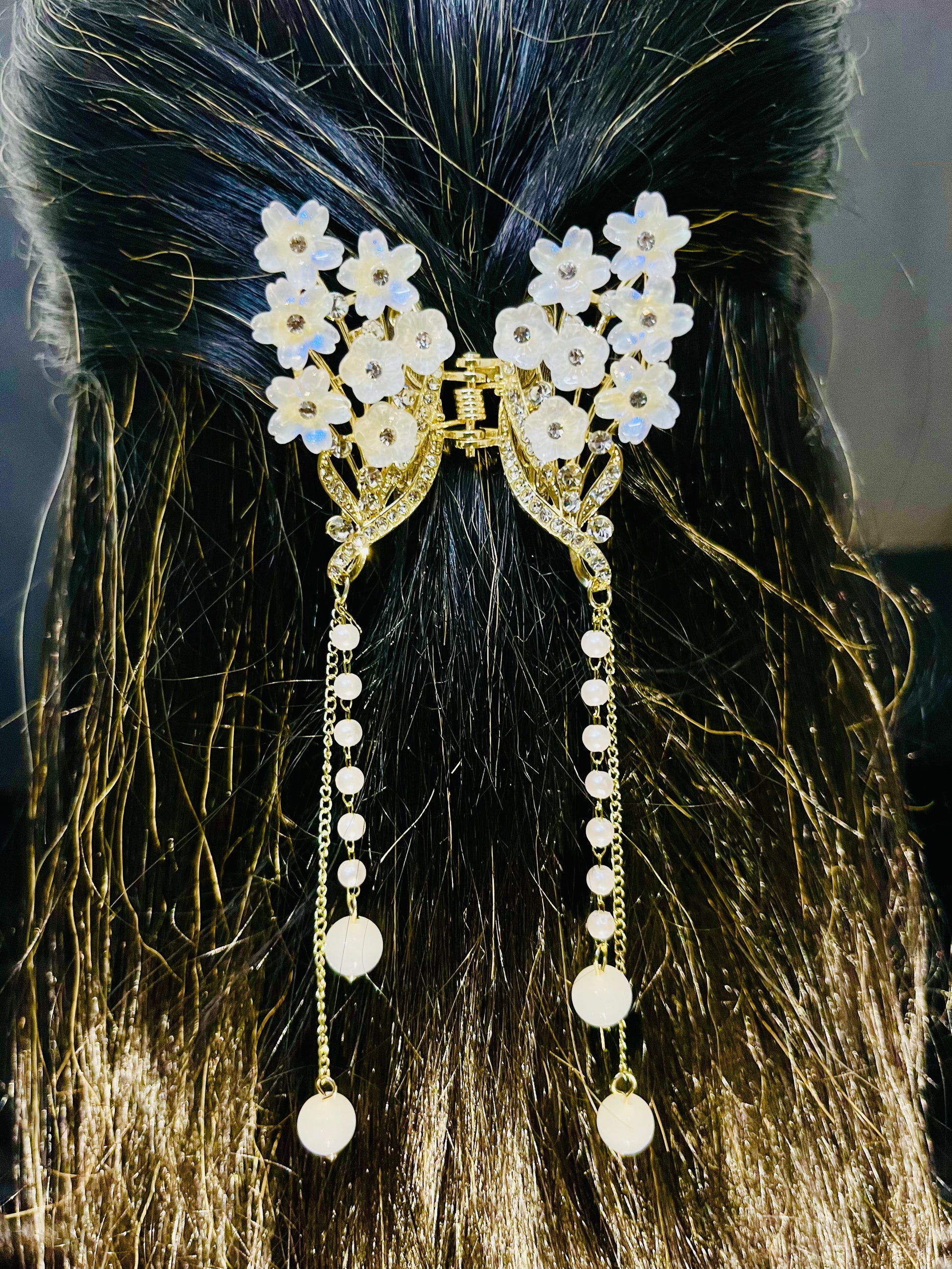 Bring elegance and sophistication to your hairstyle with this White Floral Butterfly Hair Clutcher. Designed with delicate 3D flower embellishments, sparkling crystal accents, and dangling pearl chains, this accessory is the perfect statement piece for weddings, parties, and festive occasions. The premium golden finish adds a touch of luxury, making it an ideal match for both traditional and modern outfits.