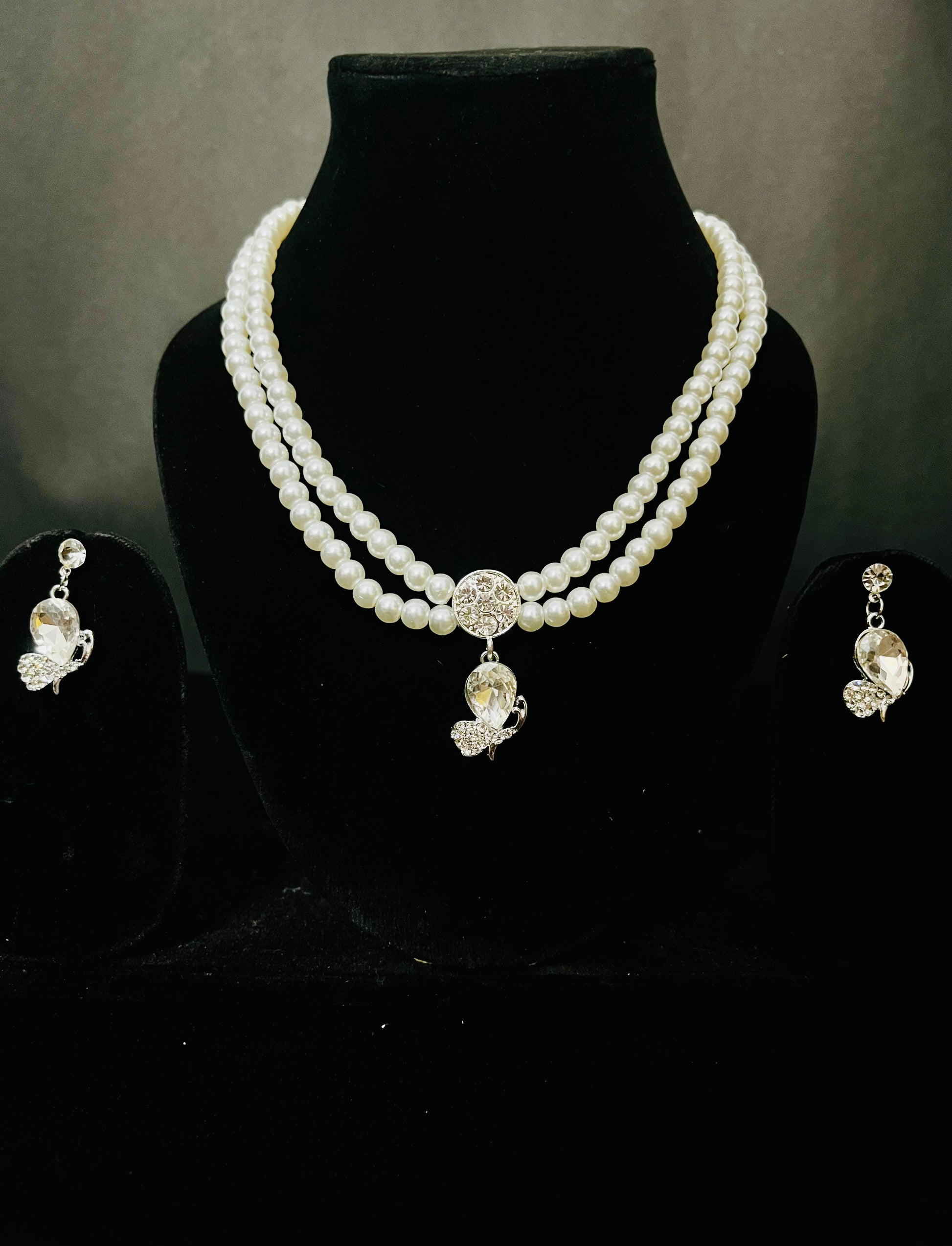 Add charm and elegance to your look with this double strand pearl necklace set, highlighted by a sparkling butterfly pendant and matching earrings. The combination of lustrous pearls and delicate butterfly detailing makes it a perfect choice for weddings, festive celebrations, and special occasions.