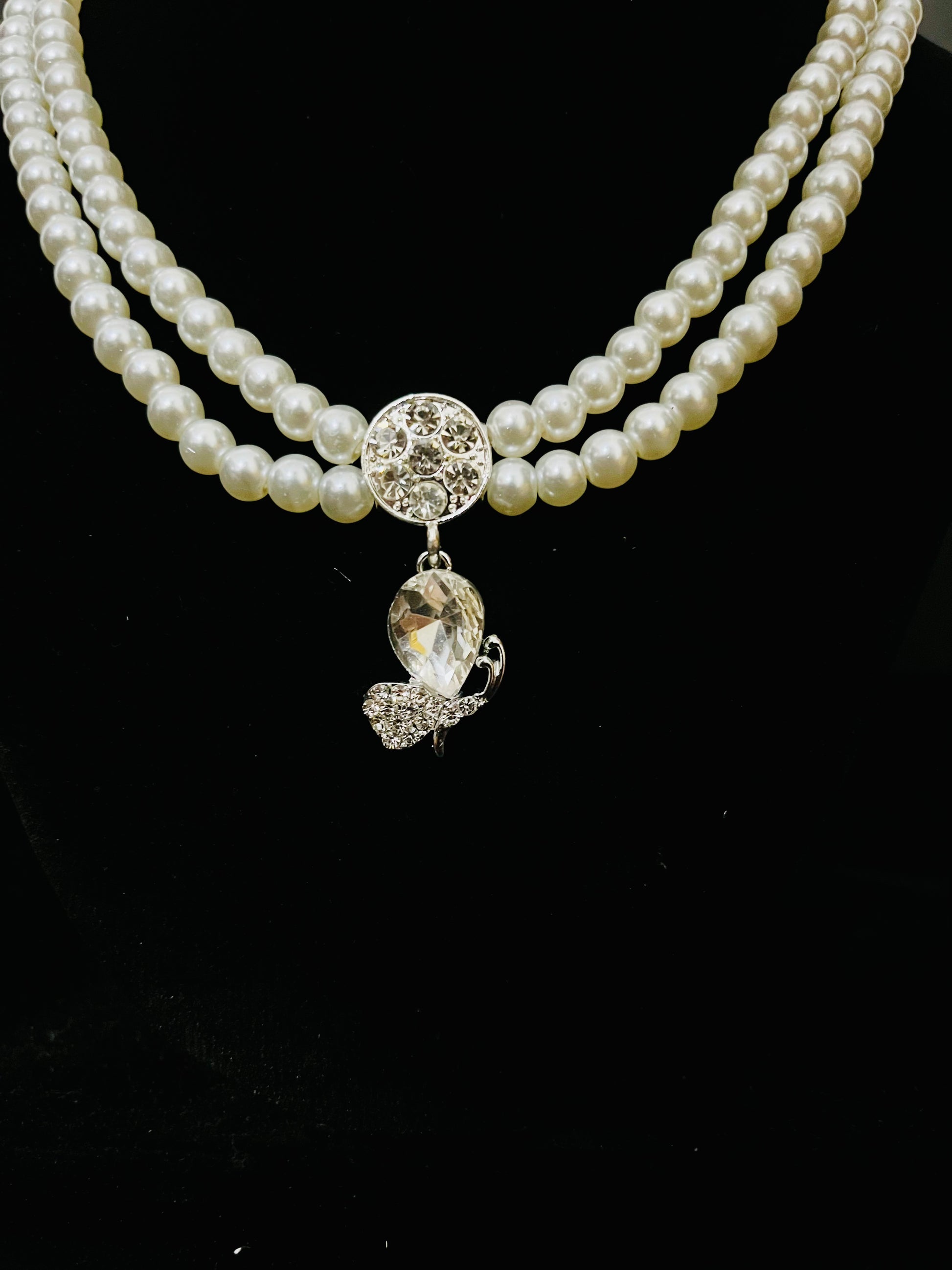 Necklace: Two rows of pearls with a crystal-studded butterfly pendant