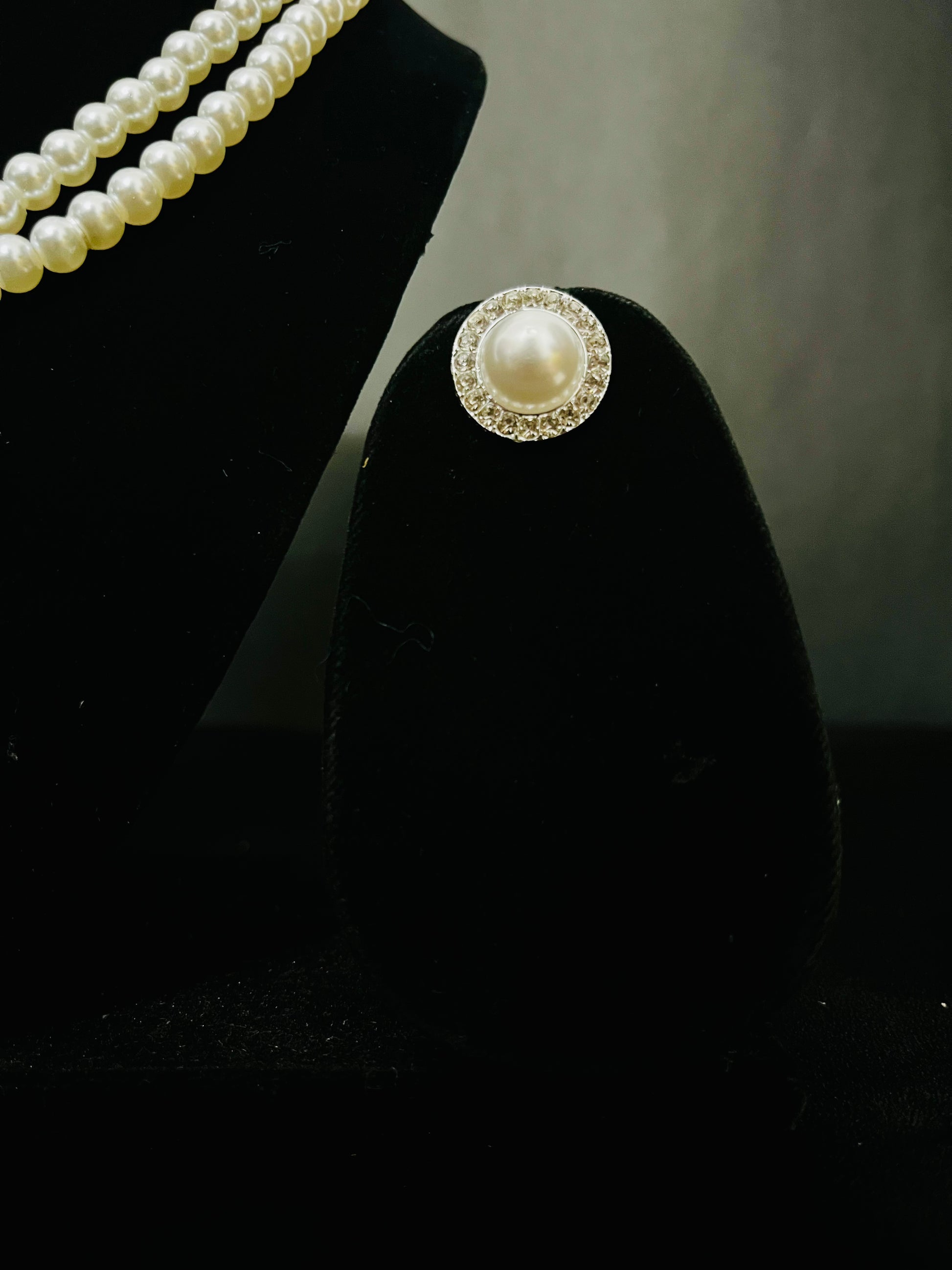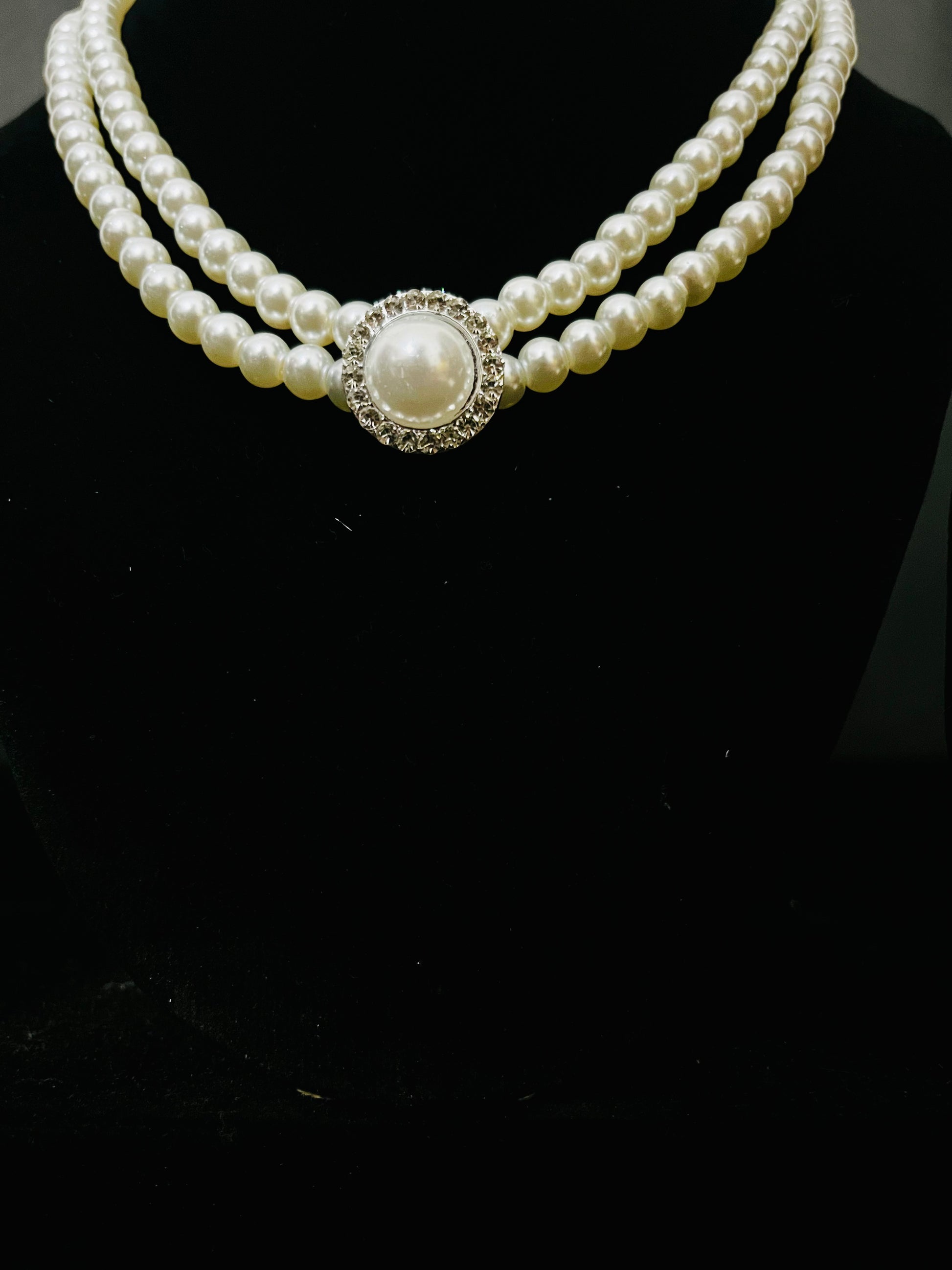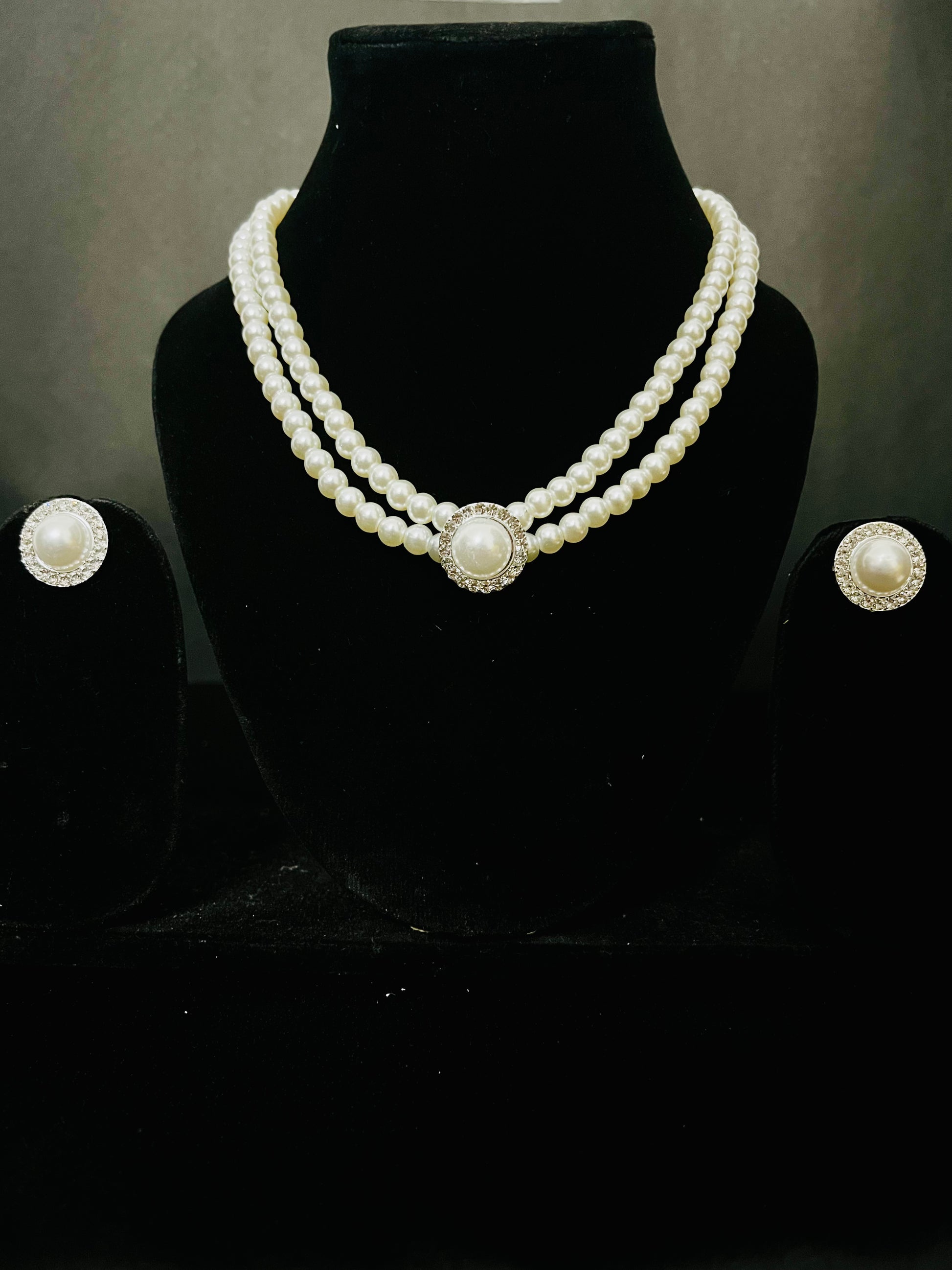Elevate your style with this double-strand pearl necklace set, designed with a stunning round stone pendant framed in crystals. The set includes matching stud earrings to complete the look. Perfect for women who love timeless elegance with a modern touch.