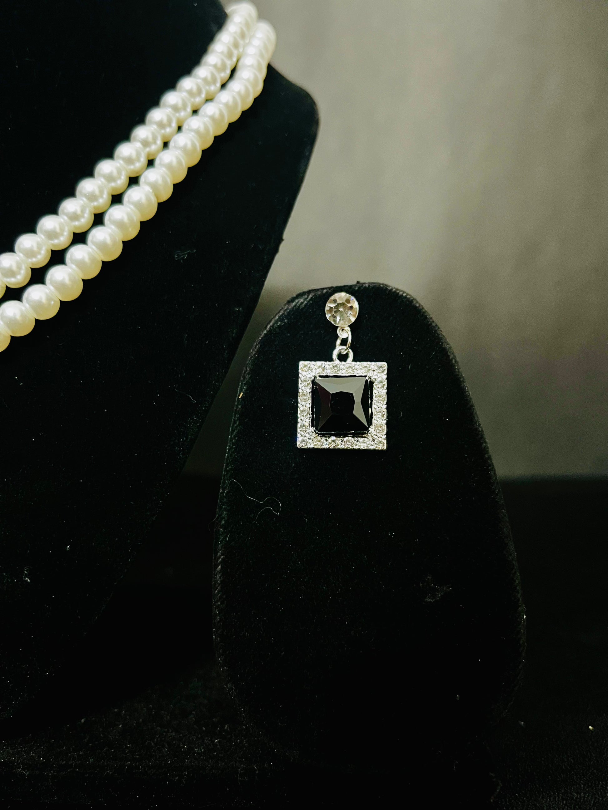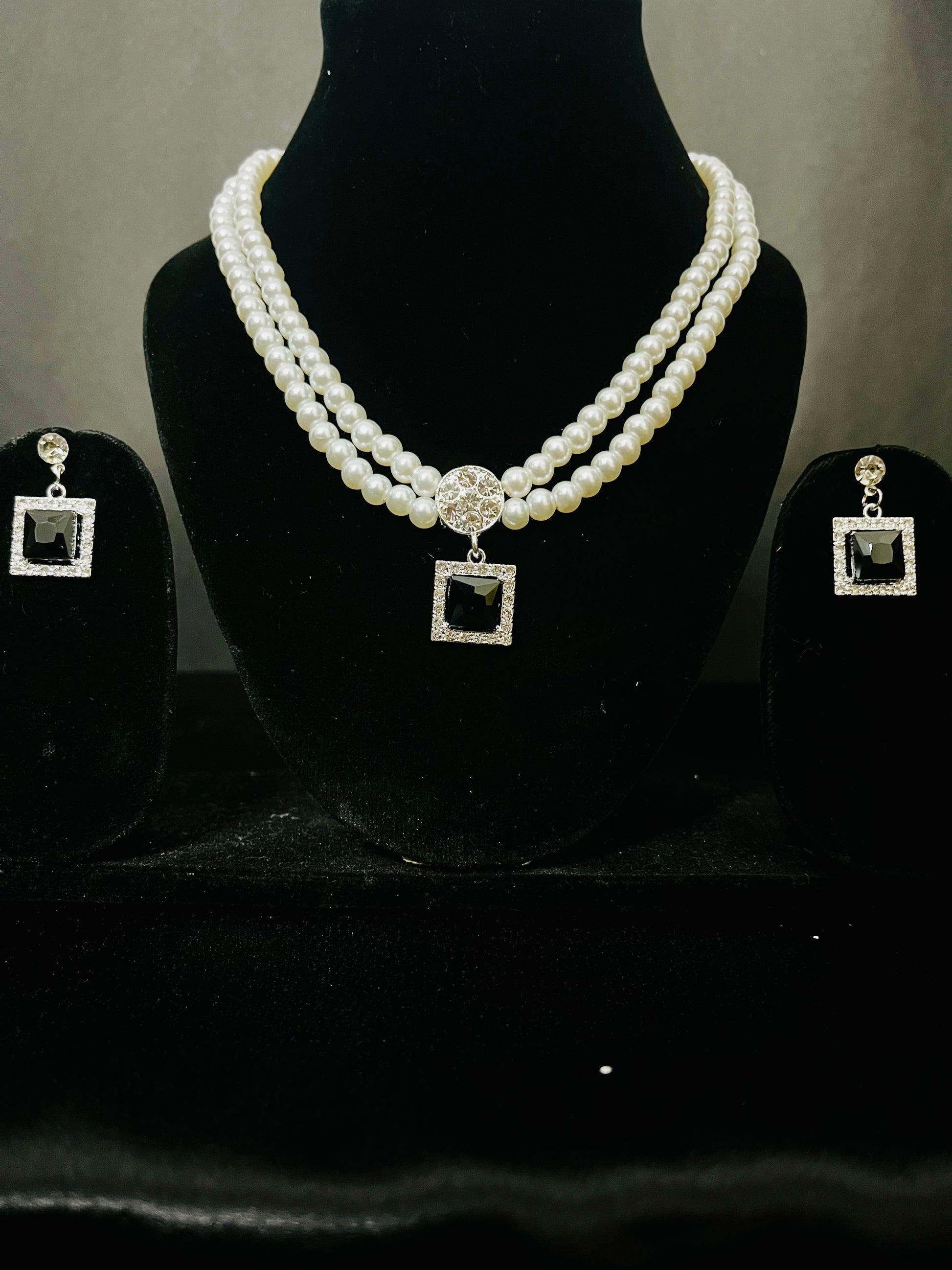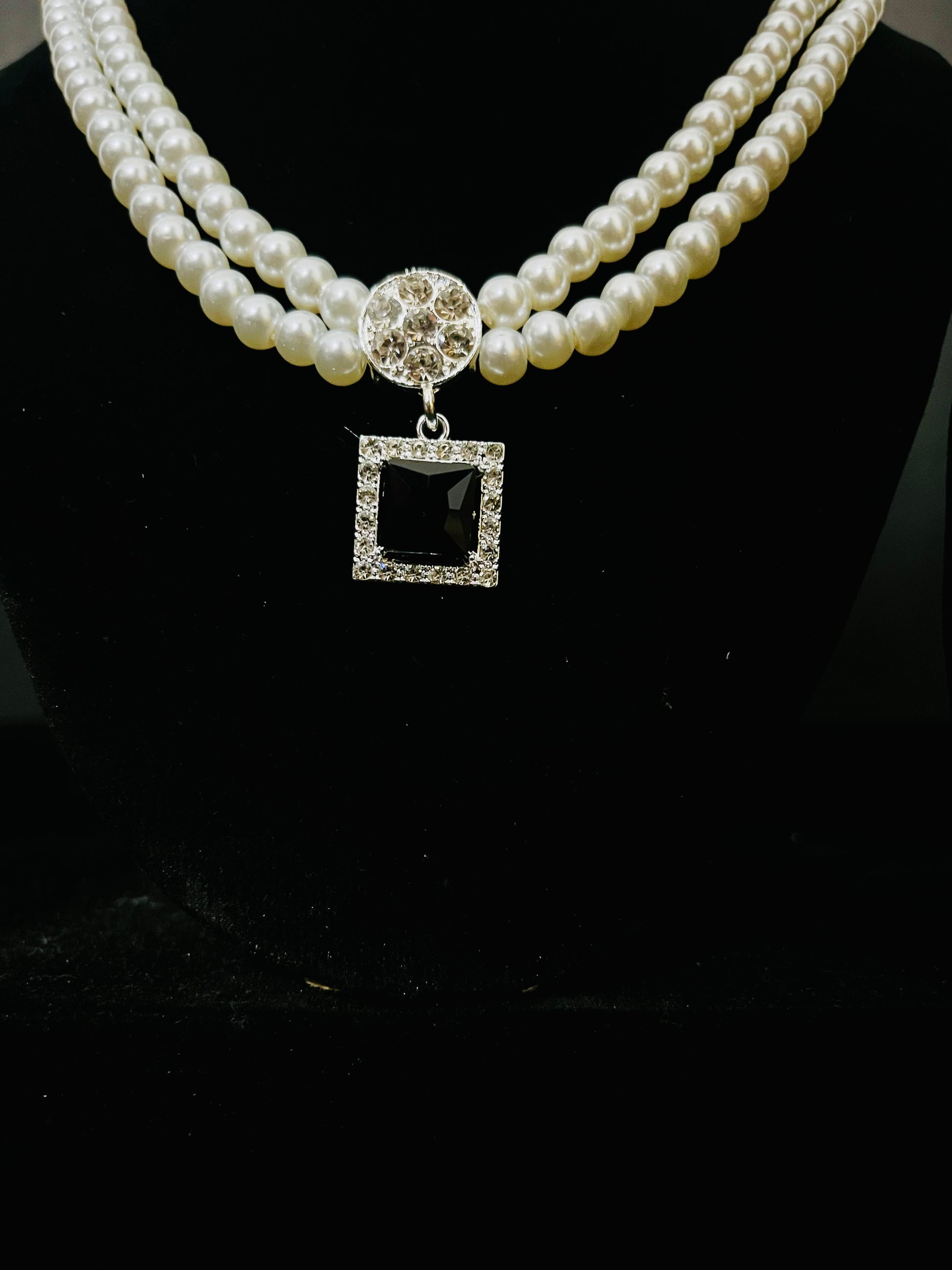 Necklace: Double row pearls with sparkling centerpiece and square black stone pendant